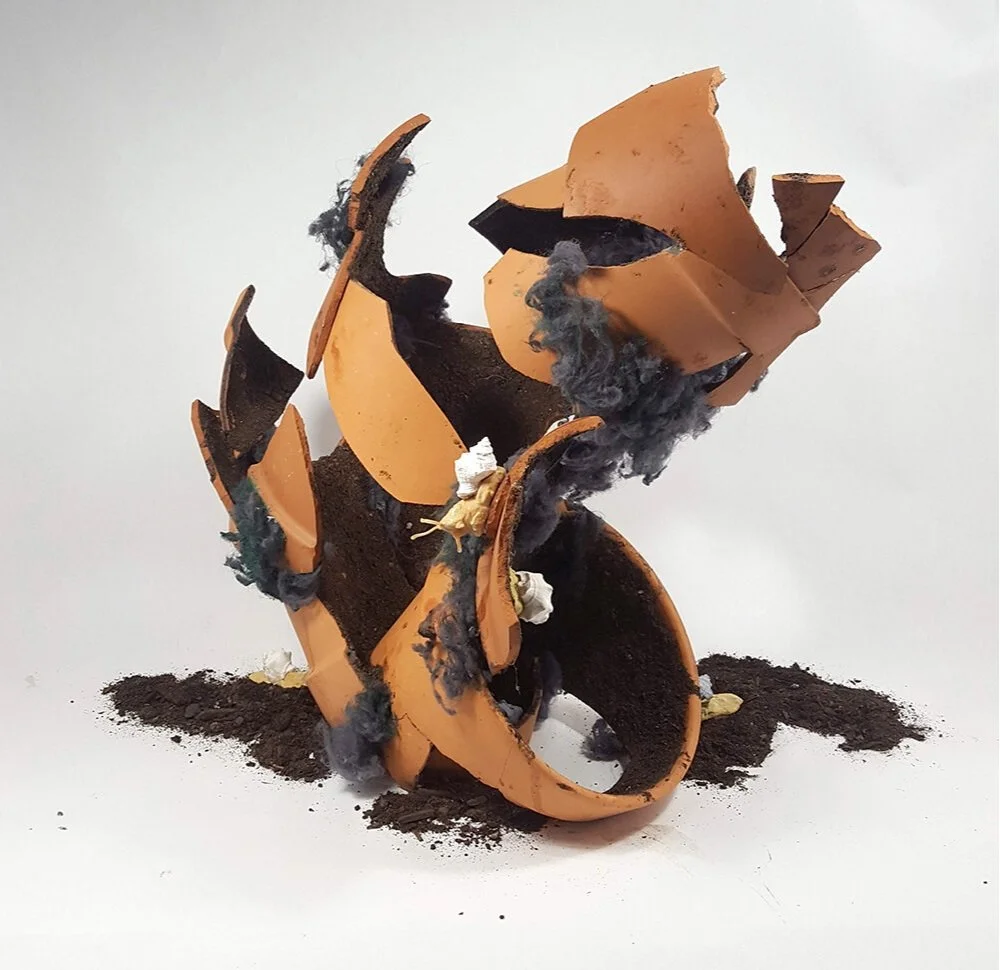 What You Don’t Know Can Hurt You explores the choice to not inform one’s self in order to avoid the mental stress of certain knowledge. This protective strategy allows one to move about freely without the fear of conceivable dangers. This can feel liberating, but the choice of ignorance does nothing to inhibit the danger itself. The assembled pots mimic a shell shape, but unlike most, it is fragile and exposes the inside. The growth of a potential threat has free access to all areas, but the snails remain unaware and mentally unburdened.